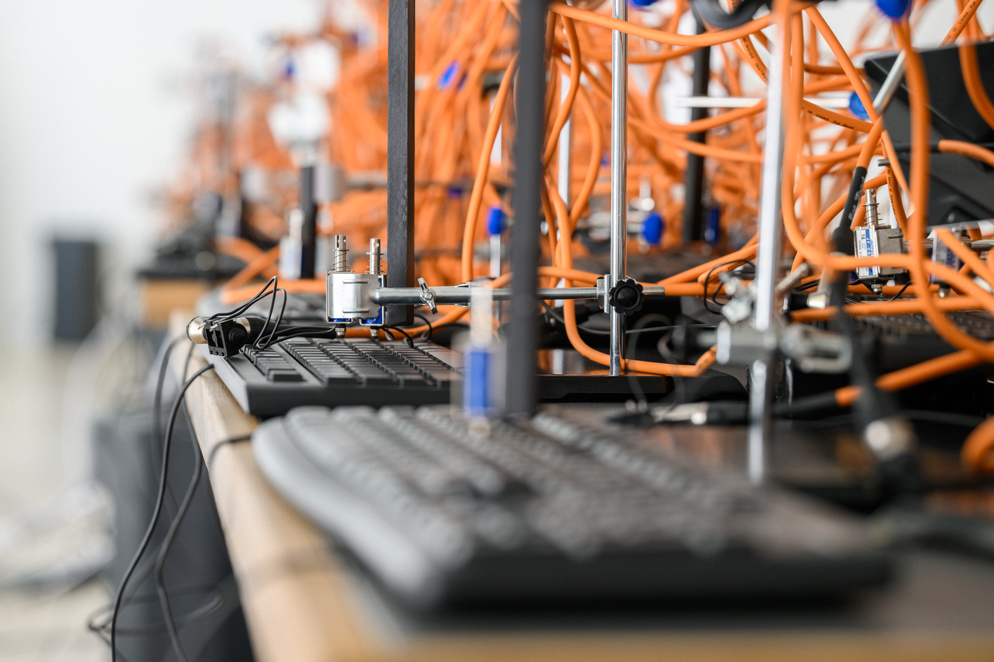 This immersive, mixed-media exhibition recreates the acoustic environment of a naturalistic “babbling brook” using the typing sounds of robotic computer keyboards as a sonic source material. This installation leverages the unusual acoustic phenomenon of simultaneous keyboard typing sounds emulating the soundscape of a stream of running water. As such, forty computer keyboards are clustered together to form a physical river within the space.