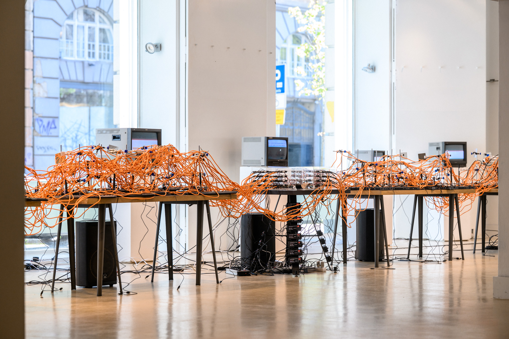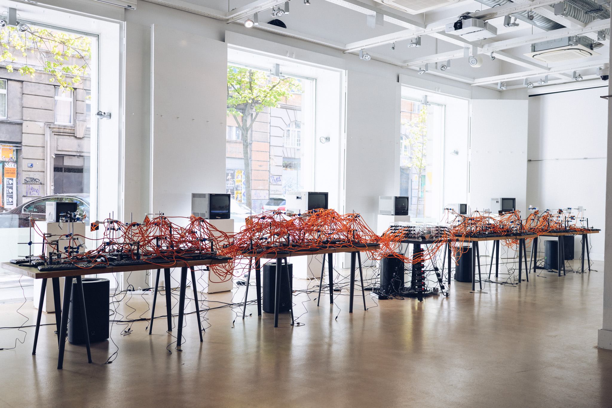 This installation features many visual component as well such as terranium habitats, CRT monitors, TVs, speakers and vintage sound devices inhabit the ‘babbling brook’ to form a hybrid ecosystem, where nature is simulated through artificial means.