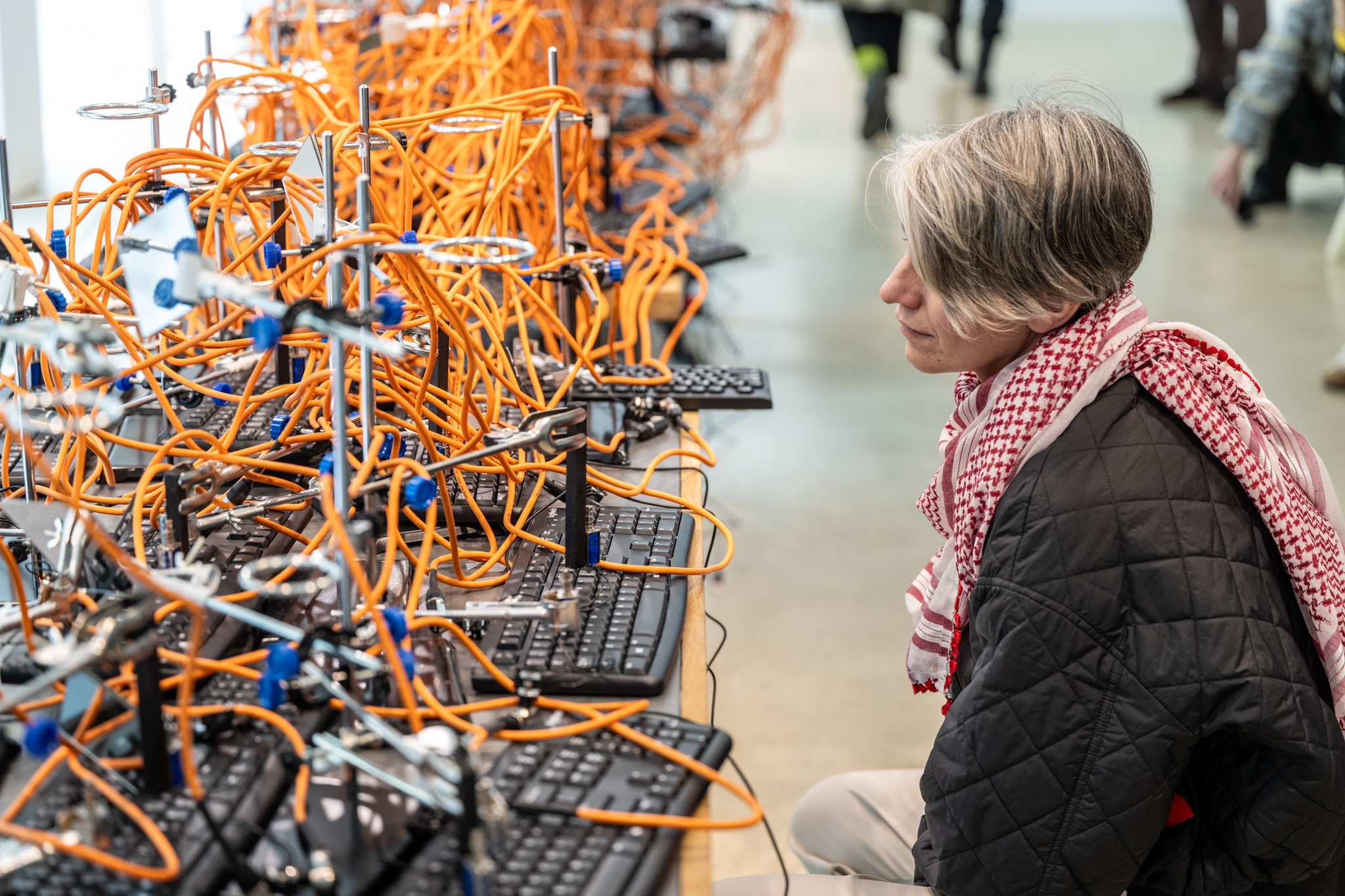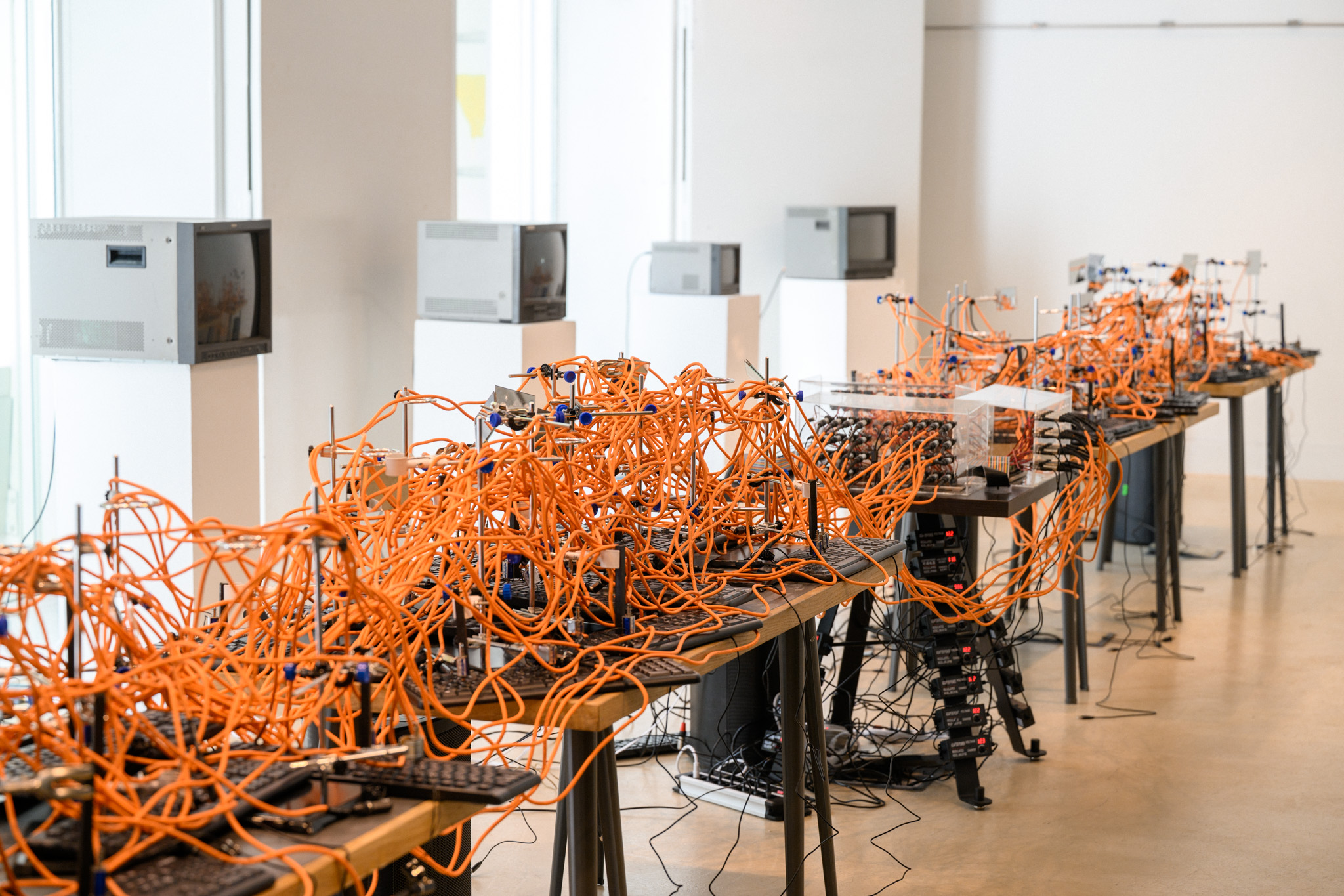 This immersive, mixed-media exhibition recreates the acoustic environment of a naturalistic “babbling brook” using the typing sounds of robotic computer keyboards as a sonic source material. This installation leverages the unusual acoustic phenomenon of simultaneous keyboard typing sounds emulating the soundscape of a stream of running water. As such, forty computer keyboards are clustered together to form a physical river within the space.